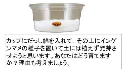 今日の学習コーナーですが,理科です。このインゲンマメを発芽(芽が出ること)させるにはどうしますか?3年生や4年生で育てたツルレイシやホウセンカを思い出してください。