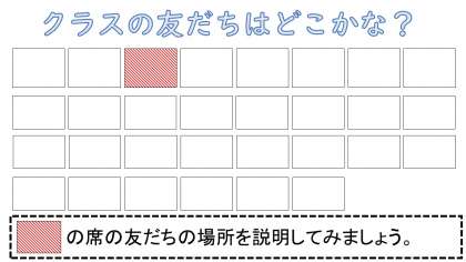 5年生は交流児童も合わせると30人。教室には30人分の座席が並んでいます。今日は赤色になっている友だちの座席の場所を説明してみましょう。あなたはどういう説明をしますか?みんなの説明を聞いてみたいですね。