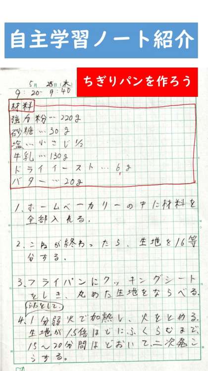 今回は,「パン作り」をし,それを自主学習ノートにまとめたものです。