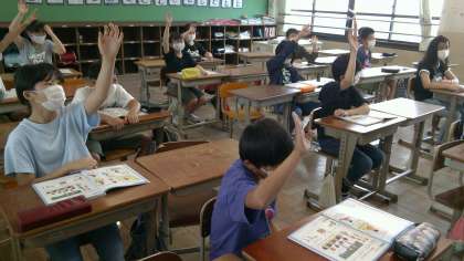 外国語科でLet’s Start 1のWarm Up 言葉の準備運動を行いました。