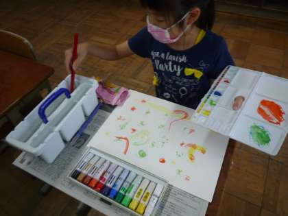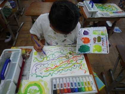 図画工作科の授業で絵の具を混ぜたり,水の量をかえたりして,自分だけの色を作ったり,ふでの持ち方を変えて,いろんな線や点などを画用紙に表現しました。楽しんで絵の具を使うことができました。