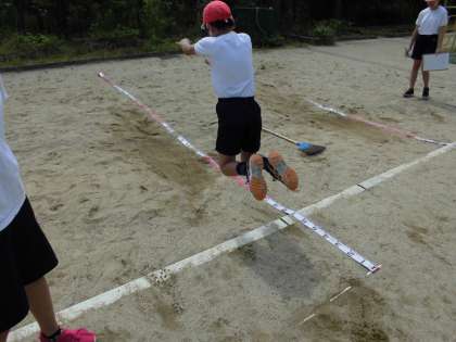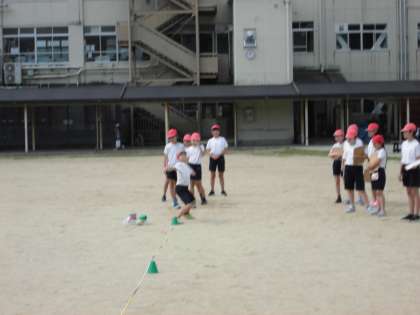 5年生は新体力テストを行っています。今日は『ソフトボール投げ』と『立ち幅跳び』の2つのグループに分かれて行いました。