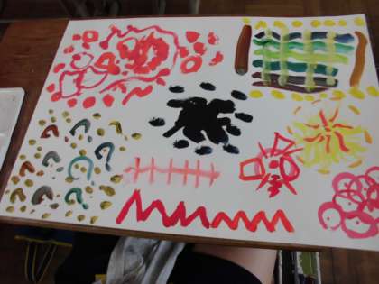 図工では絵の具を使って『心のもよう』を表しました。【楽しい】【うれしい】【さみしい】【かなしい】【イライラ】などの気持ちを色や模様を使って,表しました。