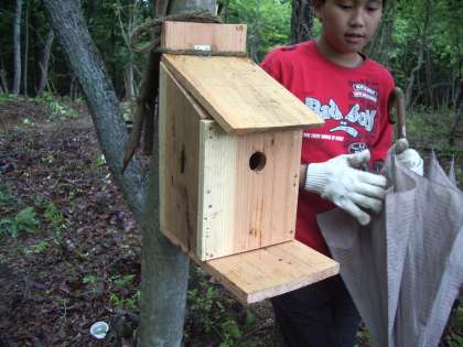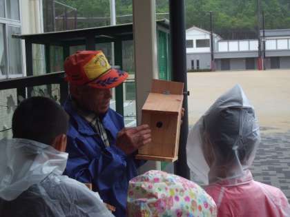 本校が、京都府より本年度から3年間、愛鳥モデル校として指定をうけることになりました。これは、今まで学校教育を通じて野鳥保護と愛鳥思想の普及に努め、地域の中心となり愛鳥活動を実践してきたことと今後さらなる活動を期待して指定していただきました。先日も野外活動クラブの子どもたちが中心になり、裏庭に地域の辻井さんに作っていただいた小鳥の巣箱を取り付けました。辻井さんに教わりながら取り付け、その後も早く小鳥が住みついてくれないかとみんな楽しみに観察しています。
