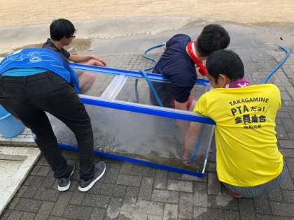 3階にある大きな水そうをお引越しして,2階に置いてみんなに見てもらえるようにします。今日はみんなで掃除をして,きれいな水を入れました。