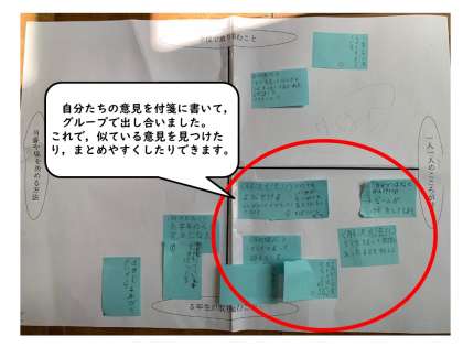 流れは1.議題を決める→2.議題に対して自分の考えを付箋に書く→3.見本を聞いてイメージをもち,グループで役割を決める→4.グループで話合い,クラスで意見をまとめる