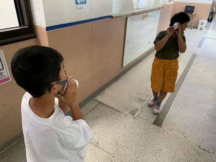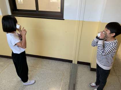糸電話の真ん中にスパンコールをつけて,声を出すとスパンコールがくるくる回ったり,糸に触るとふるえていることから音がつたわるときにものはふるえることがわかりました。実験にも少しずつ慣れて,理科を楽しく学習することができています。