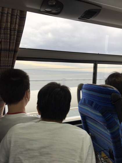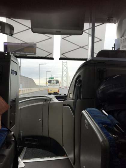 バスは淡路島に向けて明石海峡大橋を走行中です。