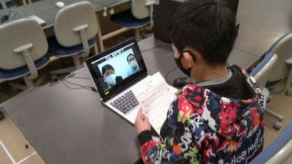パソコンの画面に相手の方が写った時は「きはった!!」「写った」「声が聞こえる」とうれしい声が聞こえてきました。