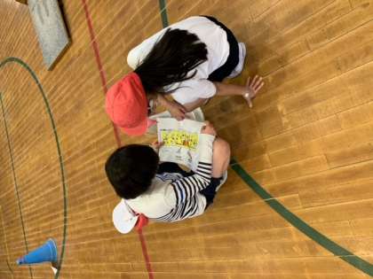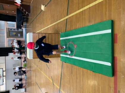 体育では,とび箱運動の学習をしています。「高さに挑戦すること」「がんばればできそうな技に挑戦すること」の2段階で学習を進めています。