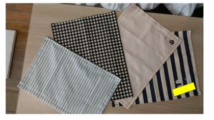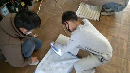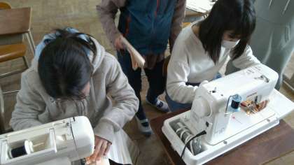家庭科の学習でランチョンマットを作っています。アイロンで折り目を付けて,まち針でとめ,ミシンで縫いました。