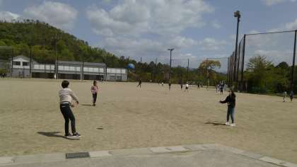 5年生担任が5年生の女子と一緒にキャッチボールをして楽しんでいます。