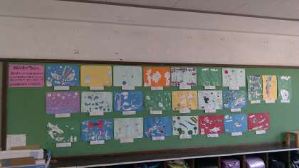 図工の「絵具でゆめもよう」を掲示しています。