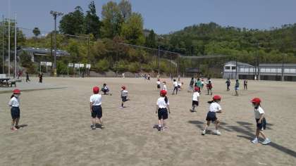 1年生は,赤白帽子をかぶって遊んでいます。
