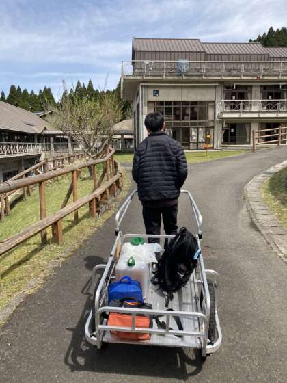 坂道の多い山の家では,荷物の移動も大変です。子ども達の飲むお茶や救急道具などリヤカーに乗せて運びます。