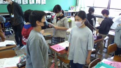 外国語の学習は単元の最後に自己紹介をします。上手な発表に向けて,学習を進めています。今日はある生き物になりきり,出身地やできることを尋ね合いました。