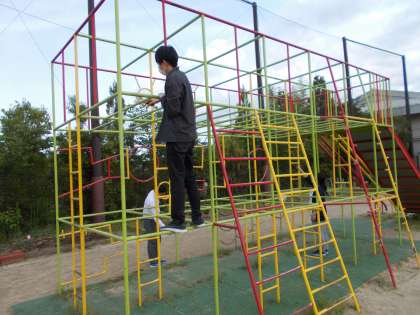 遊具で何かをしている先生達。