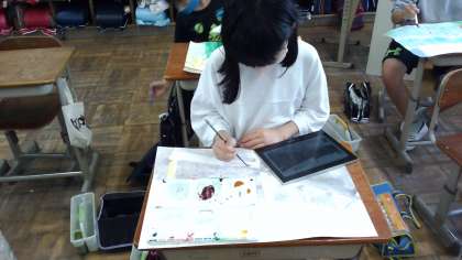 前回の彩色からさらに進みました。全体の色が加わり,バランスを見て付け足す作業に入っている友だちもいます。
