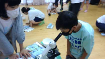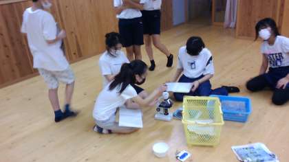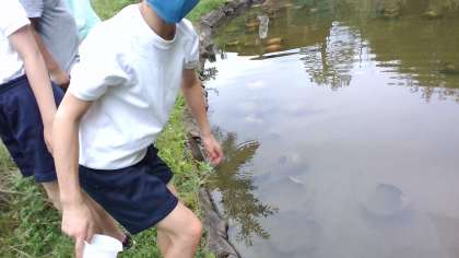 では,自然界の魚は何を食べているのだろうか。という学習課題から実際にビオトープに行って確認しました。