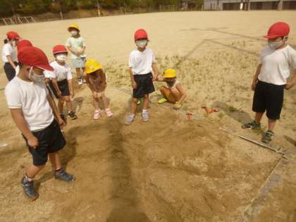生活科「なつだ とびだそう」で,運動場にある砂場をつかった楽しみ方を考えて,楽しみました。グループで砂山をつくりトンネルをつくったり,川をつくって他のグループとつなげたりして楽しみました。