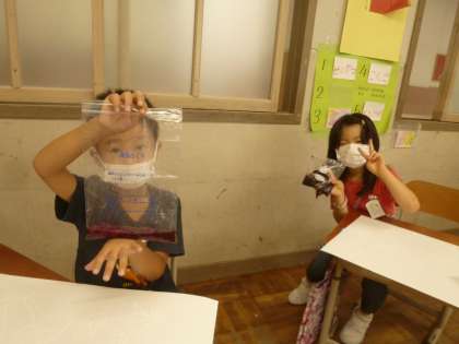 その色水を筆で画用紙にぬると,白のクレパスが水をはじいて,クレパスで描いた絵が浮かび上がってきます。子ども達からは驚きの声があがっていました。