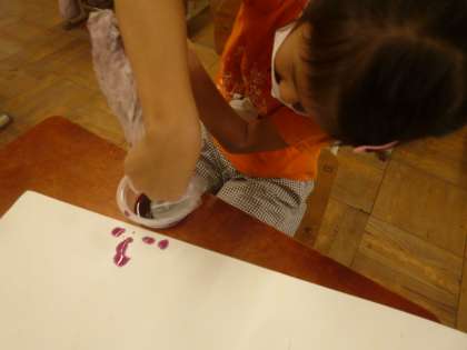 まず白の画用紙に白色のクレパスで絵をかきました。もちろんなにを描いているのかはっきりしません。そこで夏休みの間にとっておいた朝顔を水と一緒にビニル袋に入れて紫色の色水をつくりました。