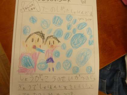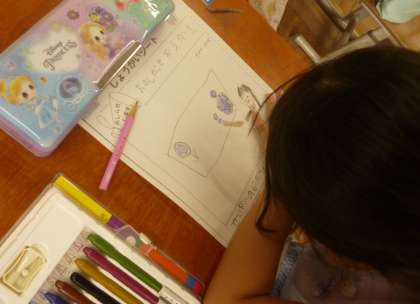 生活科の単元のまとめに入っています。これまでどんな「おまつり」をしてきたのかを思い出して,一番思い出にのこっている活動をワークシートにかきました。文章を書くところには,国語科で学習した「いつ,どこで,だれと,なにを,どうした」にそって上手にかくことができました。
