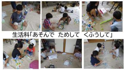 たくさんのペットボトルやペットボトルのキャップをつかって