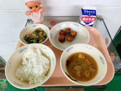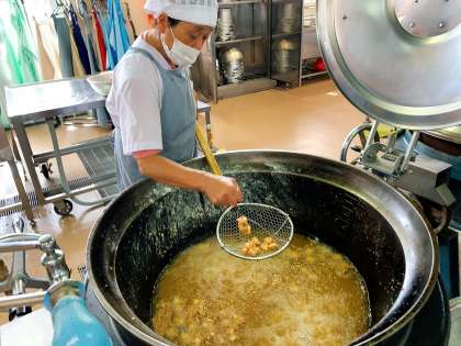 塩こうじに漬けてあるので,揚げるとすぐに色が付き,焦げやすいのですが,調理員さんが絶妙な火加減で外はカリッと中はふわっと仕上げてくださいました。噛むと塩こうじの香りが鼻からぬけて,とてもおいしい味わいでした。