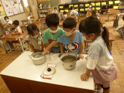 今日は「おおきさくらべ」の単元の最後の学習となりました。最後の学習は,「やかん」と「なべ」のおおきさくらべをしました。どちらにたくさん水が入っているのかを,まず予想して,比べ方を考えました。昨日の学習をふりかえりながら,どうしたらよいのかをみんなで考えて解決することができました。「同じ大きさのコップに水を注いで,その数を数える。」ことで,どちらが大きいのかを確かめることができるとわかりました。