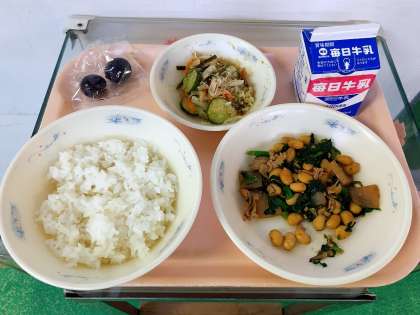 今日はたっぷりの大豆を使った「肉みそいため」でした。八丁味噌を使って味付けをしています。少し濃いめの味付けがごはんに合う一品です。