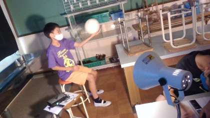 子ども達は形が変わるのは月と太陽の位置が関係あると考え,ライトを太陽,ボールを月に見立てて実験をしました。