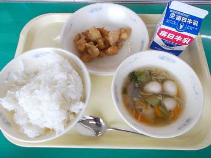 給食では,揚げた鶏肉にタレをからめて仕上げています。