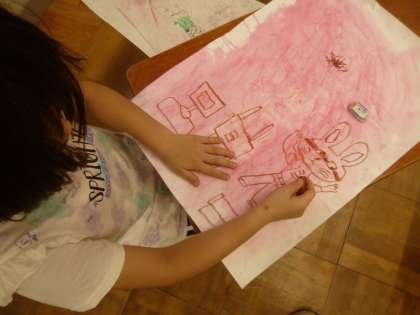 今日はコンテを使って,登場人物やまわりのモノをかきました。4ツ切りの画用紙に描くので,「登場人物を大きく描く。」をめあてにがんばりました。来週の図画工作科の時間に完成なので,とても楽しみです。