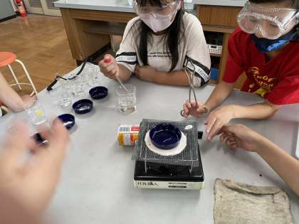 子ども達は,蒸発させれば中にあるものが分かると考え,水溶液を蒸発させて何が残るかの実験をし,それぞれの液体には,においの違いや蒸発させると白いものが残るものあるなど,それぞれの水溶液の特徴に気づいていました。