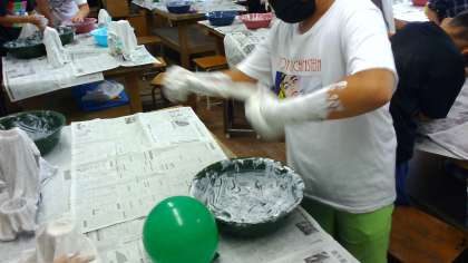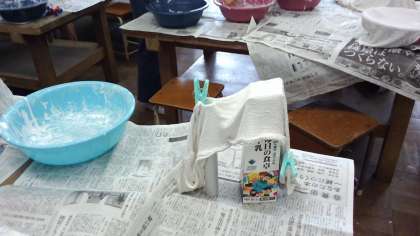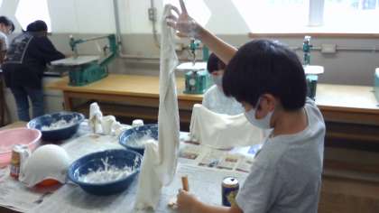 作品作りに入ると,布を液体粘土に浸して自分のイメージした形に近づけるように工夫をしていました。 来週は色を塗って完成です。