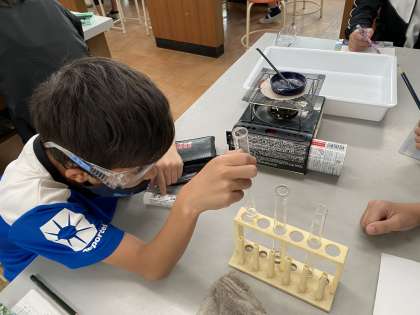 理科の「水よう液の性質」で,塩酸にアルミニウムを入れると溶けてなくなったことから,その溶けたアルミニウムがどうなったかについて調べました。
