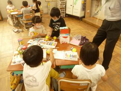お家からもってきた箱に,おり紙をのりではったり,模様や絵を描いたりしてかざっていく活動をしました。事前に「みんながもってきた箱に,なにを入れたいかな。」と質問すると,ハロウィーンが近いのか「お菓子!」との答えが多くありました。