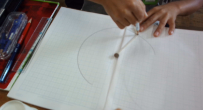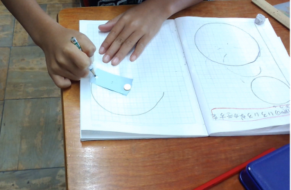 丸い形のいろいろなかき方を考えました。画鋲をうまく中心にして,丸い形のかき方を見つけ出していました。その後,コンパスを使って丸い形をかいてみました。