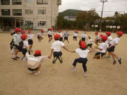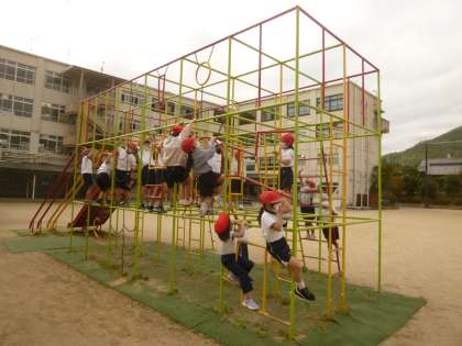 今日の国語は教室ではなく,運動場でやりました。体操服に着がえてです。くじらぐものお話のように,空に向かって「おうい。」とさけんだり,「天までとどけ 1,2,3」といって跳んだりしました。最後にジャングルジム(総合遊具)にのぼって,「さようなら。」とみんなで言いました。みんなの声がくじらぐもに届いたのでしょうか。