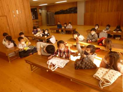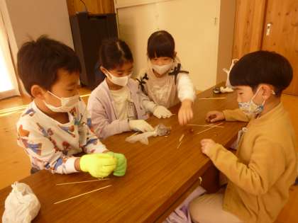 「あきといっしょに」の大詰めを迎えています。今回は学習棟で工作をしました。前回はどんぐりに穴を一つだけあけて「どんぐりごま」をつくりましたが,今回は「やじろべえ」や「うま」「きりん」などの動物をつくりました。