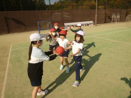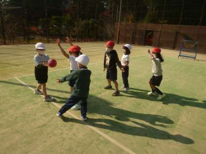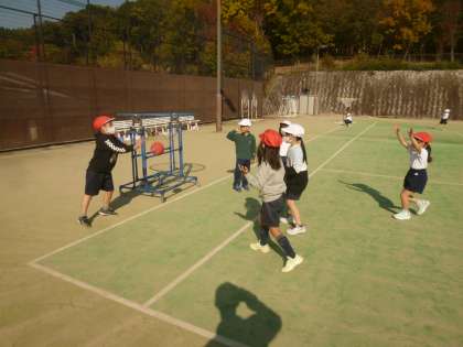 体育では「パスゲーム」をしています。大きな輪の中にパスをつないだボールを入れて得点を競う運動です。はじめてのバスケットボールのようなゲームなので,ルールを覚えたりするのが大変ですが,ゲームを通して慣れ親しみ,友達同士で声を掛け合いながらパスをする姿も見られました。たくさんの「ナイスボイス」を出していきましょう!