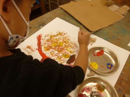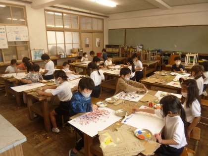 題名からイメージをふくらませて,作品作りをすると「どんなところに,何色のハンコを押そうかな。」と考えながら自分のつくったダンボールのハンコを押していました。出来上がってからの鑑賞会が楽しみです。