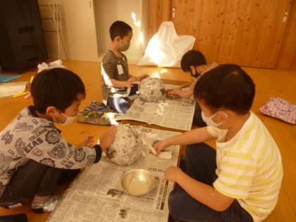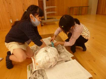 来年の図画工作展に向けての作品づくりを少しずつ進めています。新聞紙で型をつけたものに白い半紙を張りました。新聞紙と同じように,まずは半紙をやぶって,のりにつけて,丁寧に貼りました。なんの,どんな表情にするのかは,今週の図工の時間に発表したいと思います。