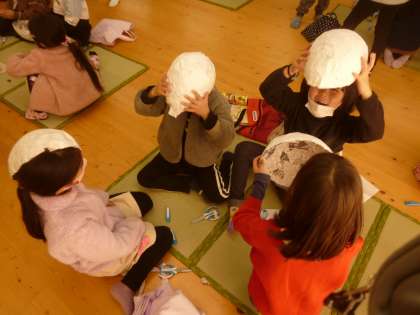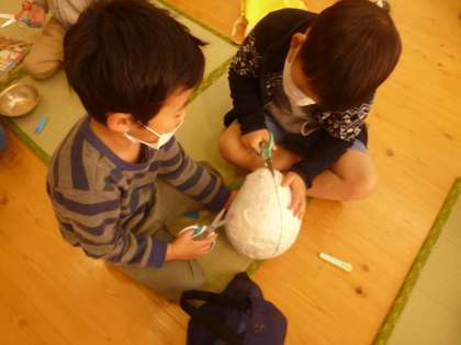 今日は,風船でかたをとった新聞紙,和紙をハサミで切ってお面を作りました。早速頭にかぶったり,どんなお面をつくるのかワクワクしていました。お面のテーマは「オニ」です。喜怒哀楽をオニのお面で表現したいと思います。来週は色塗りをしていけたらなと考えています。