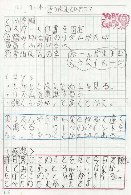 自主学習ノートに体育で学習中の走り幅跳びに関する内容がありました。