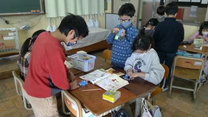 理科「電気の通り道」では,回路の一部にアルミ缶などを入れ,電気を通すか,電気を通さないかを,比べながら調べました。