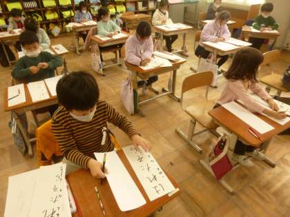 少し早いですが,「かきぞめ」をしました。先週は「ともだち」,今日は「はれたそら」を書きました。「かきぞめ」は鉛筆ではなく,フェルトペンで書きます。慣れないペンで書くので,最初は心配しながら書いていましたが,慣れてくるとスラスラと丁寧に書くことができていました。