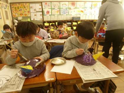鬼のお面の完成が近づきました。今日は面の表情をかきました。まゆ毛や目の向きを少し変えるだけで,いろいろな表情になります。子ども達はどの表情にしようかと悩みながら色をぬっていました。最後に自分の指に黒色の絵の具をつけて,面の目玉をつけて仕上げました。次回は髪の毛やひげなどをつけたいなと思います。
