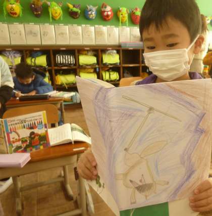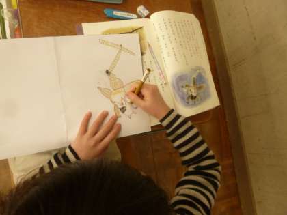 国語科「たぬきの糸車」では自分のお気に入りの場面を一つ選んで,その場面の絵を画用紙にかきました。挿絵を参考にえがく子や自分の思い描いた場面の絵をかく子など,見ていてとても楽しかったです。